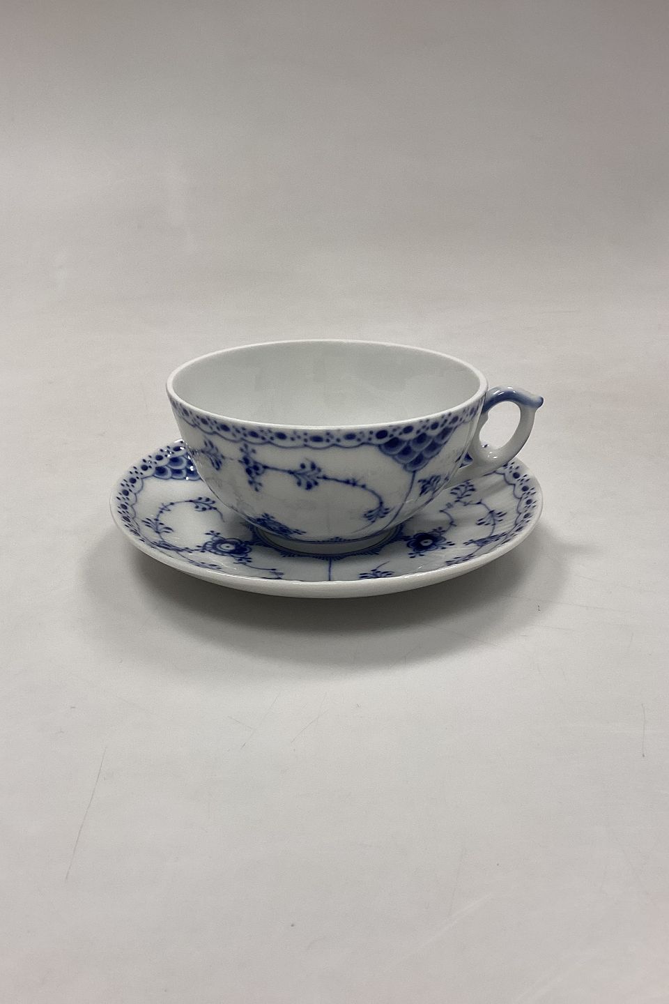 Royal Copenhagen Musselmalet Halvblonde Stor Tekop No. 656. Måler: Kop 5,5 cm x 10,5 cm / 2,16 in. x 4,13 in. Underkop 15 cm / 5,90 in.