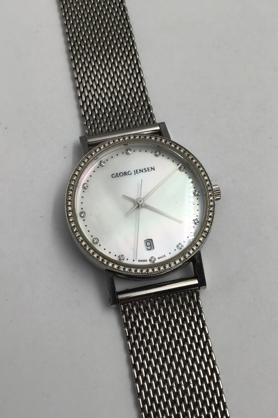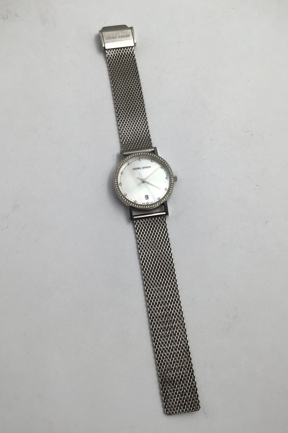 Georg Jensen Stål Dame Ur No. 321 Henning Koppel Perlemorsskive, Diamantkrans, Safir glas, Mesh Lænke