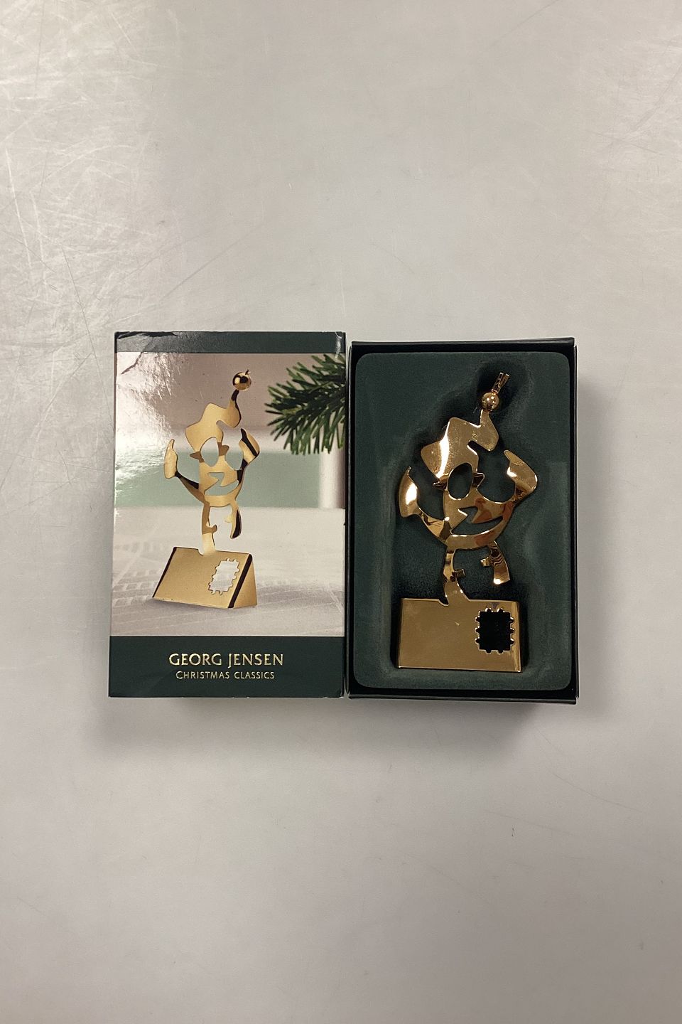 Georg Jensen Christmas Classics Julepynt - Nisse på Julekort. Designet af Leo Griffin. Stål forgyldt med 24-karat guld.