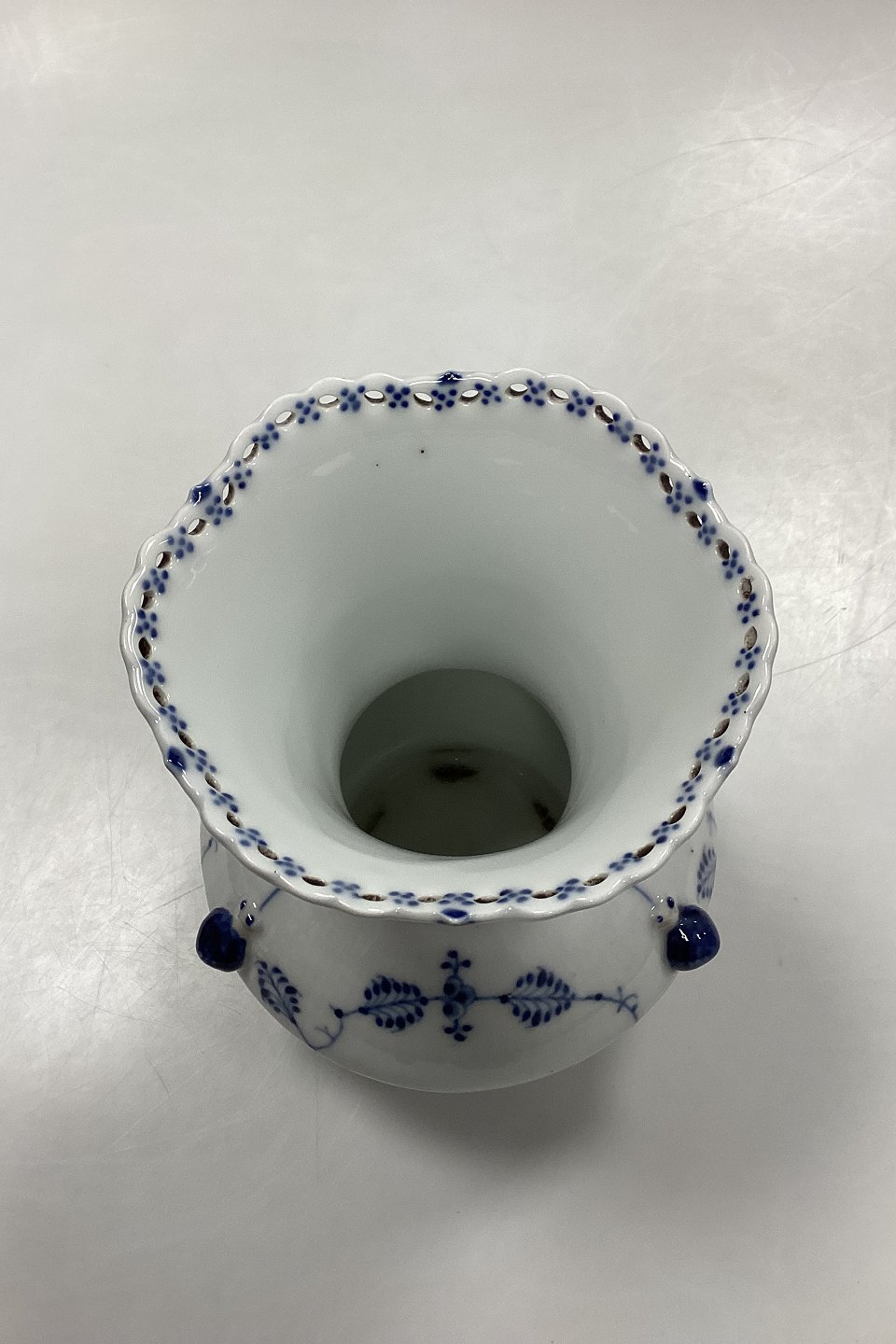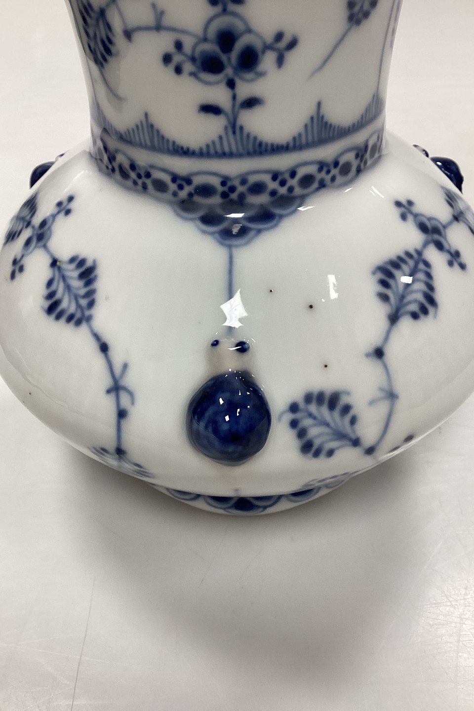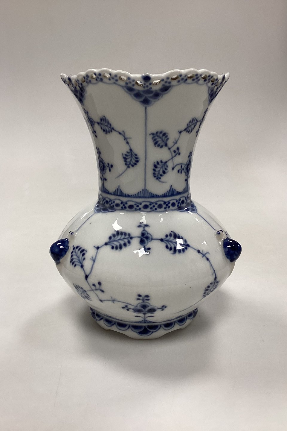 Royal Copenhagen Musselmalet Helblonde Vase No. 1197. Små sorte nister i glasuren, og brændningshul på sneglehus, se fotos.