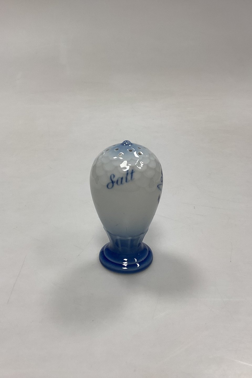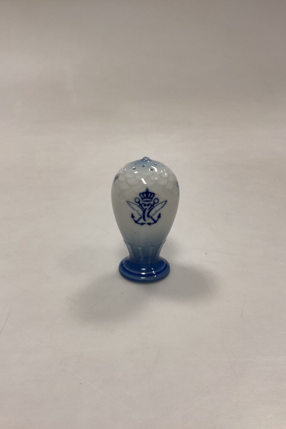 Bing og Grøndahl Blå Tone Saltbøsse No. 52 A med Logo. Logo med krone, hjul med vinger og ankre er højst sandsynligt fra et shippingfirma.
