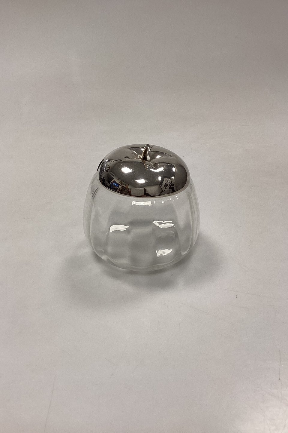 Engelsk Sølvplet/EPNS Marmeladekrukke. Glasset har optiske riller, og låget er formet som toppen af et æble.