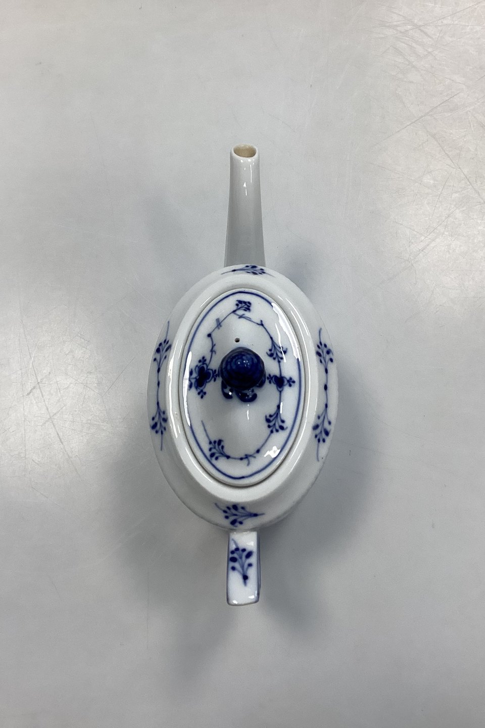 Royal Copenhagen Musselmalet Riflet Oval Tekande No. 253. Måler 9,5 cm / 3,74 in. i højden uden låg. Måler 12,5 cm x 9 cm / 4,92 in. x 3,54 in. uden hank og tud.