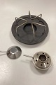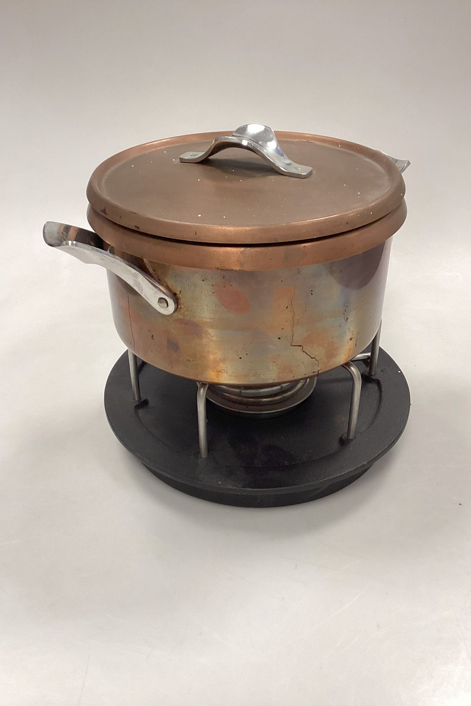 Komplet sæt med gryde, låg, holder, brænder og bundfad. Tydelige brugstegn, men i god stand.