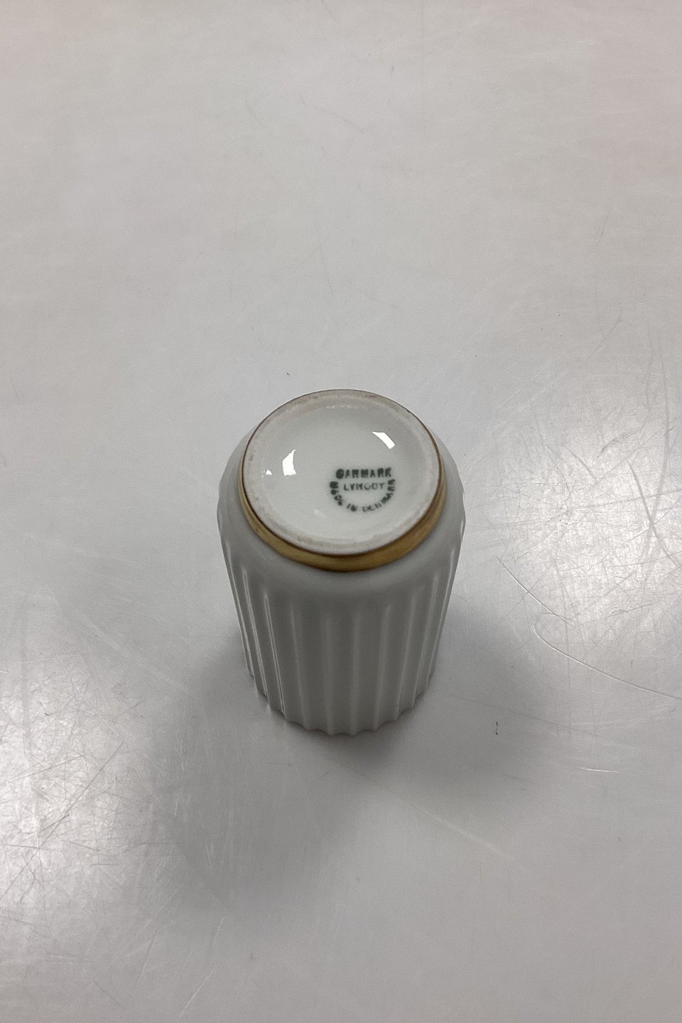 Lyngby Vase, lille. Hvid rillet form med guldkant. Måler 8 cm / 3,15 in.