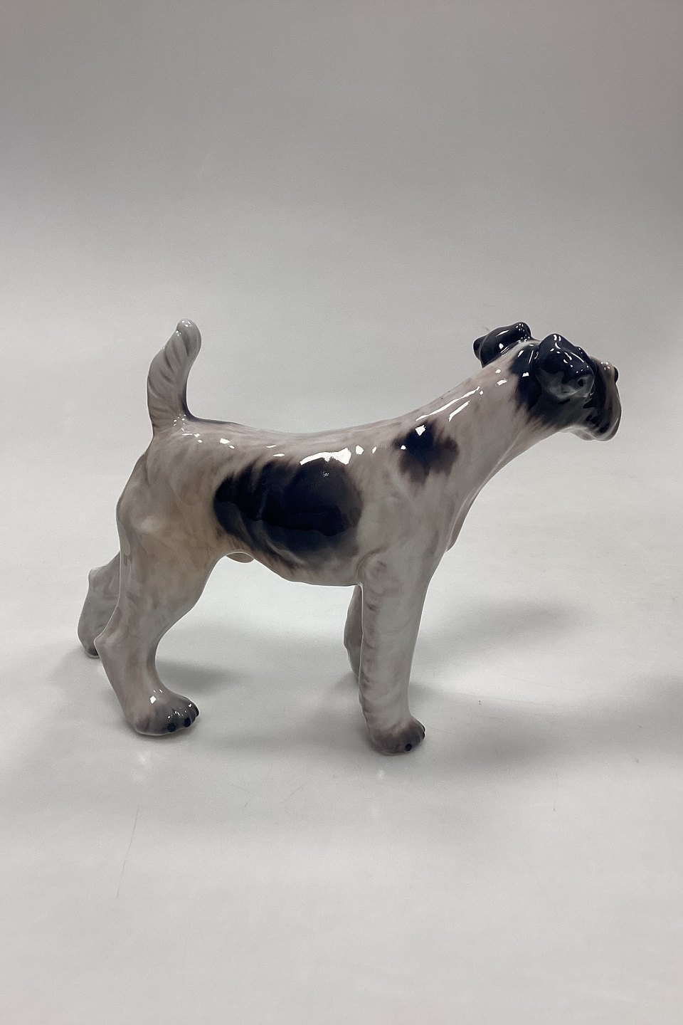 Dahl Jensen Figur - Ruhåret Foxterrier No. 1009. Beigebrun med mørke aftegninger. 2. Sortering med lille sort plet på ryggen.