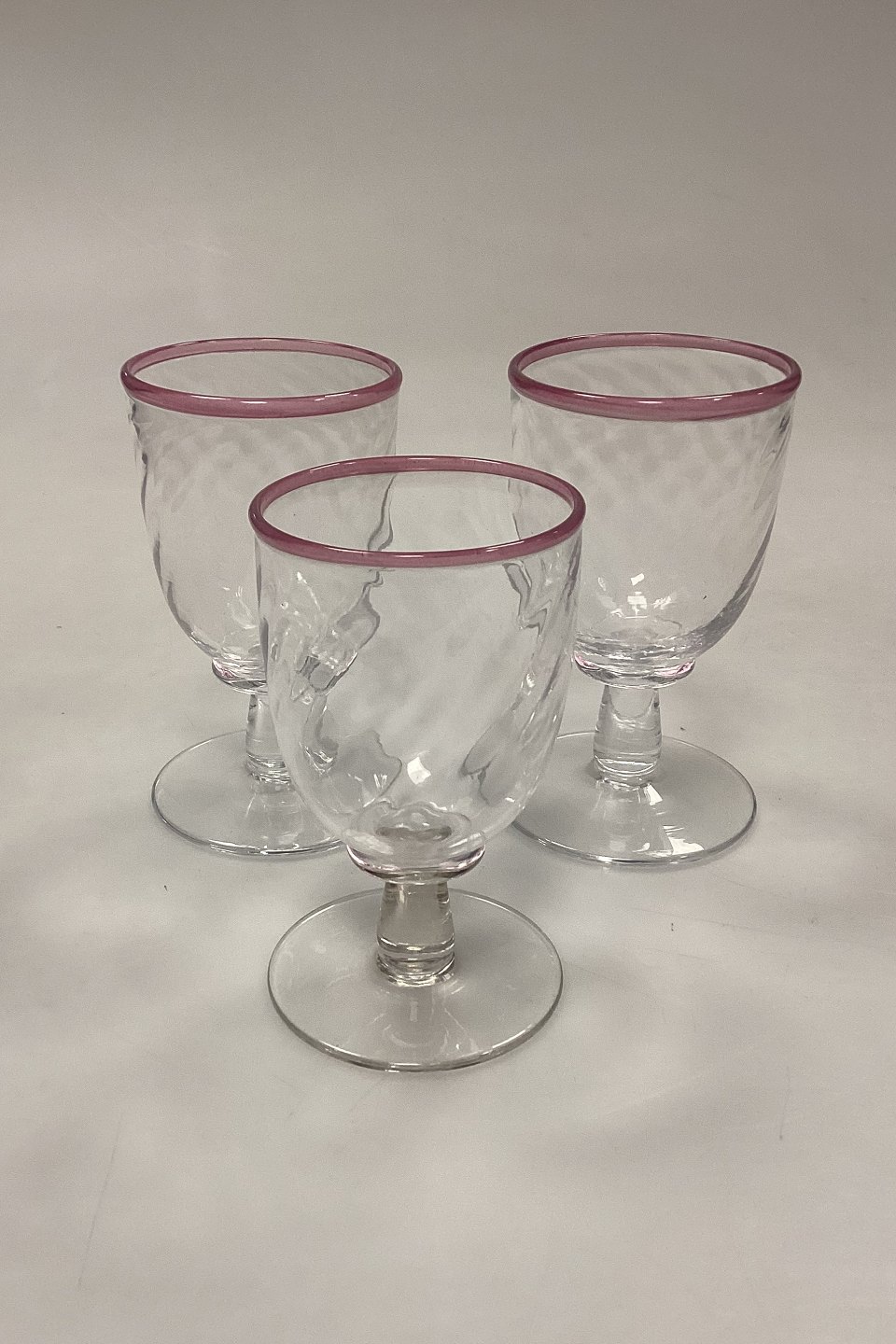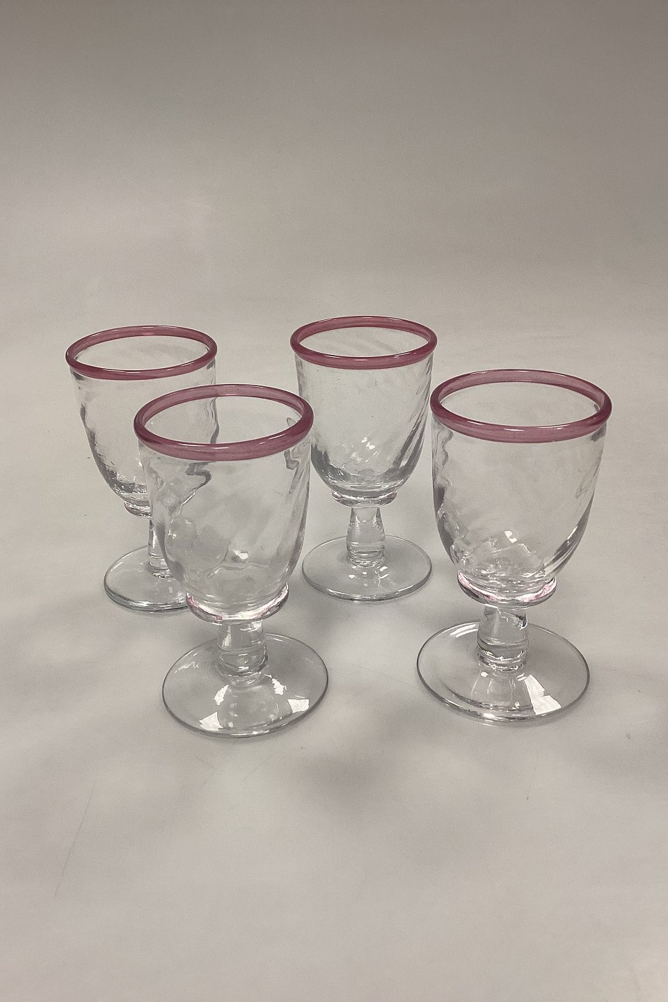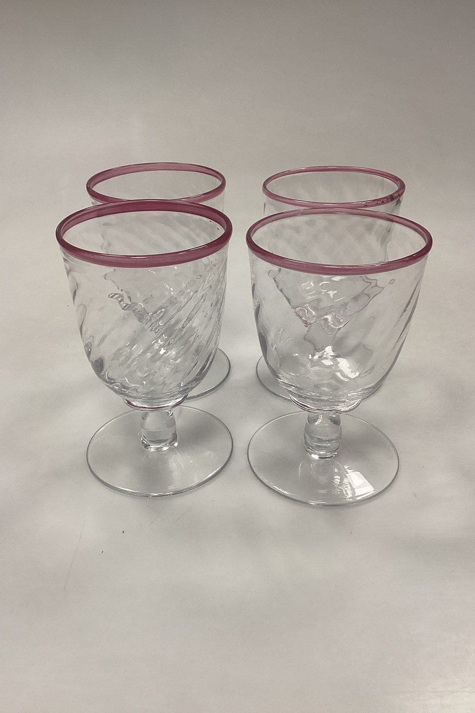 Stort sæt af håndlavede glas på 24 dele. Klart glas med snoet optik og rosa kant.