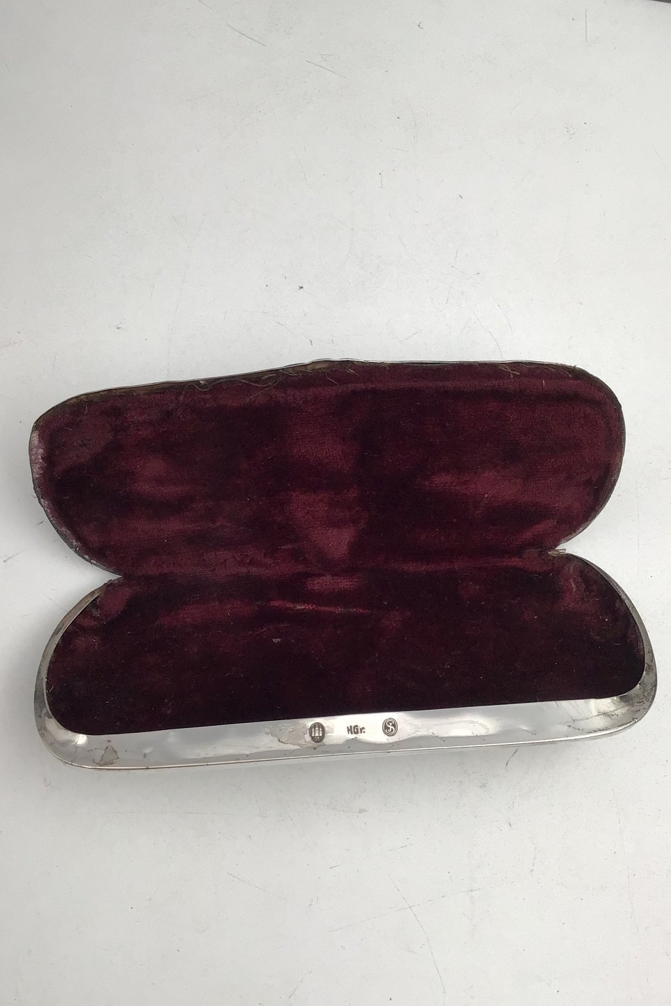 Hugo Grün Sølv Brille Etui (1933) Måler 13.8 cm x 5.8 cm x 2 cm (5.43 inch x 2.28 inch x 0.78 inch) Vægt 80 gr (2.83 oz) (Graveret / Brugsspor)