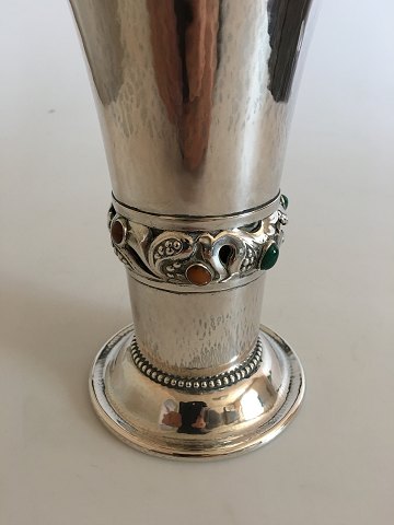 Georg Jensen 830 Sølv Skønvirke Vase No 132 Med Indfattede Sten af Rav og Grøn Agat påsat på gennembrudte bladslyngninger . Fra 1919. 17.5 cm høj. Vejer 387 g.