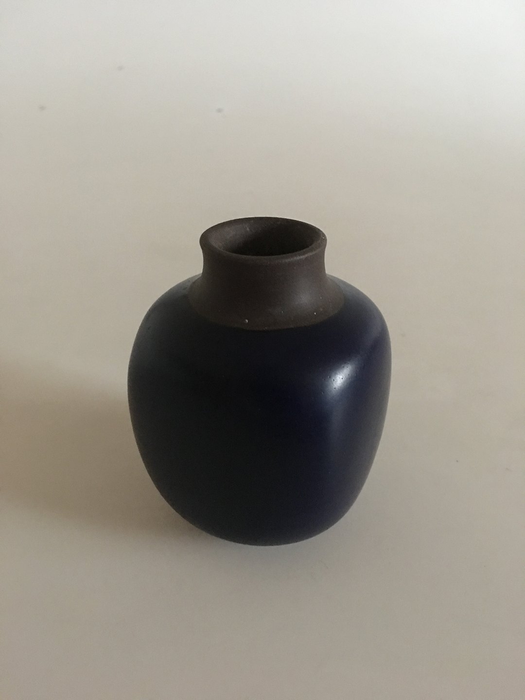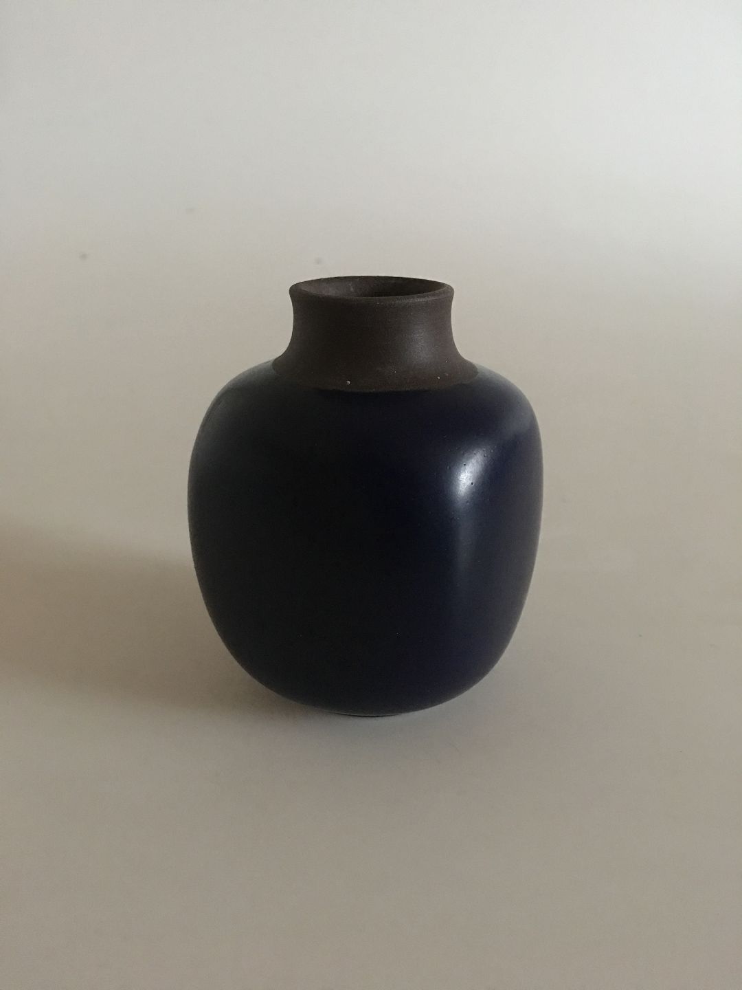 Royal Copenhagen Lille Stentøjsvase No 21590/B220-3 med Blå Glasur. 8.5 cm H. I perfekt stand. 1. sort.
