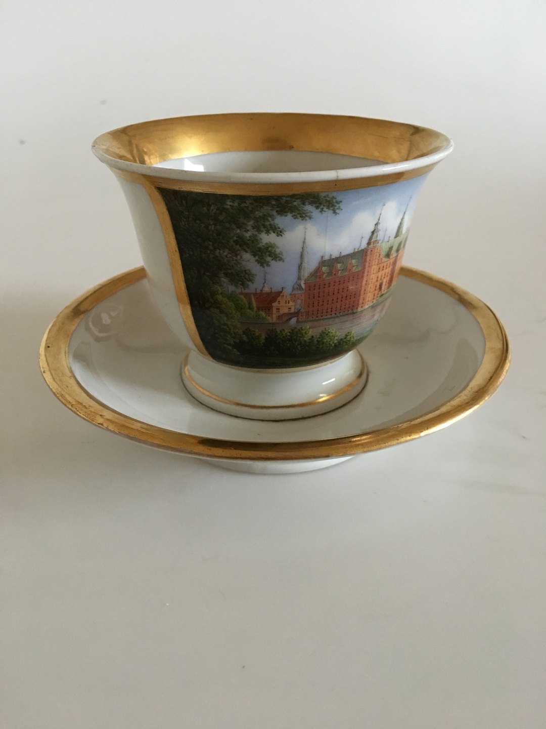 Royal Copenhagen Antik Morgenkop og Underkop med Håndmalet Motiv af Frederiksborg Slot. I god stand. Det håndmalede motiv er intakt uden ridser, og guldet ser pænt ud med kun lidt slid. Koppen har en hårrevne på siden, og en hanken har en reparation. Koppen er 9 cm Høj og 11.5 cm Ø.