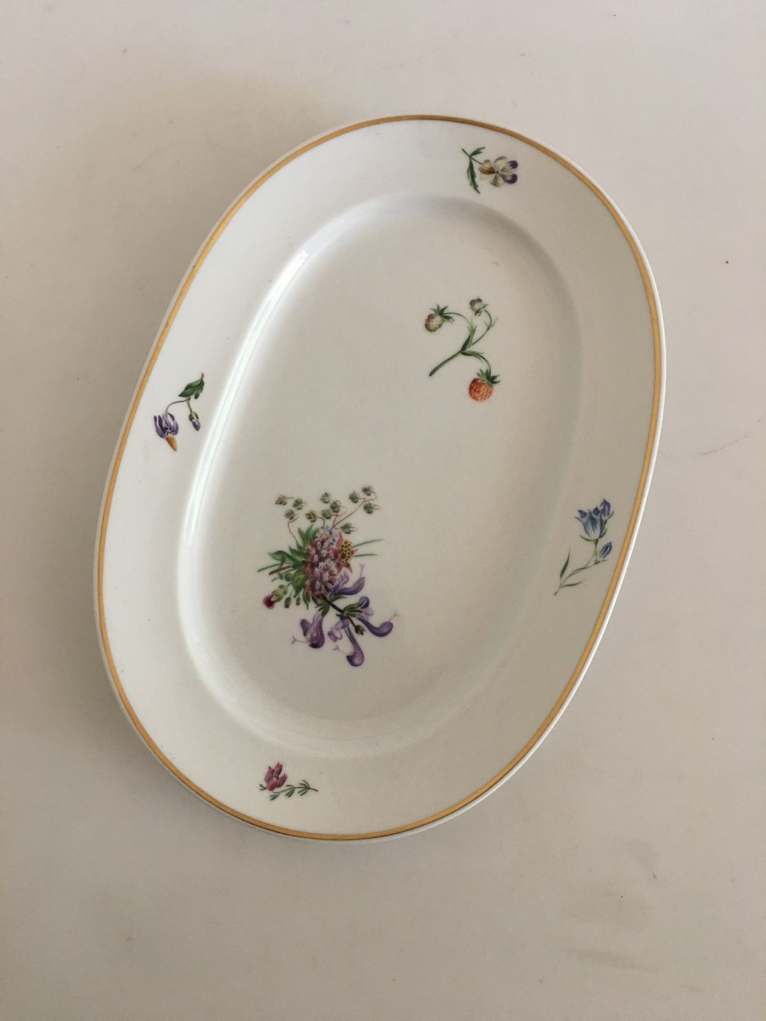 Royal Copenhagen Primavera Thorkild Olsen Ovalt Fad No 1515/14005. Med Flad Kant. Hvidt stel med blomsterdekoration og guldkant. Fadet måler 28 x 19.5 cm