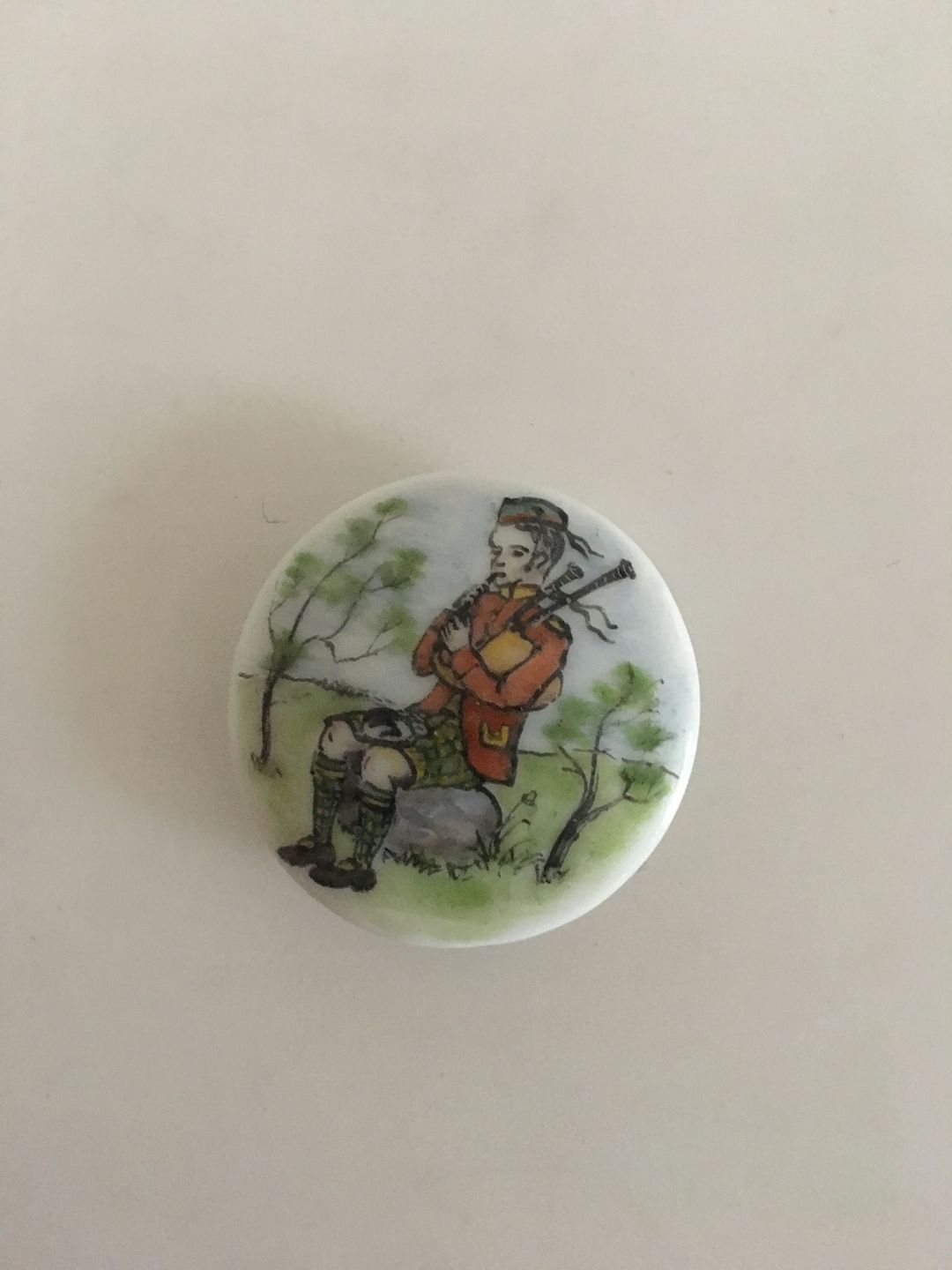 Royal Copenhagen Porcelænsknap med Håndmalet motiv af Musikant. 3 cm Ø