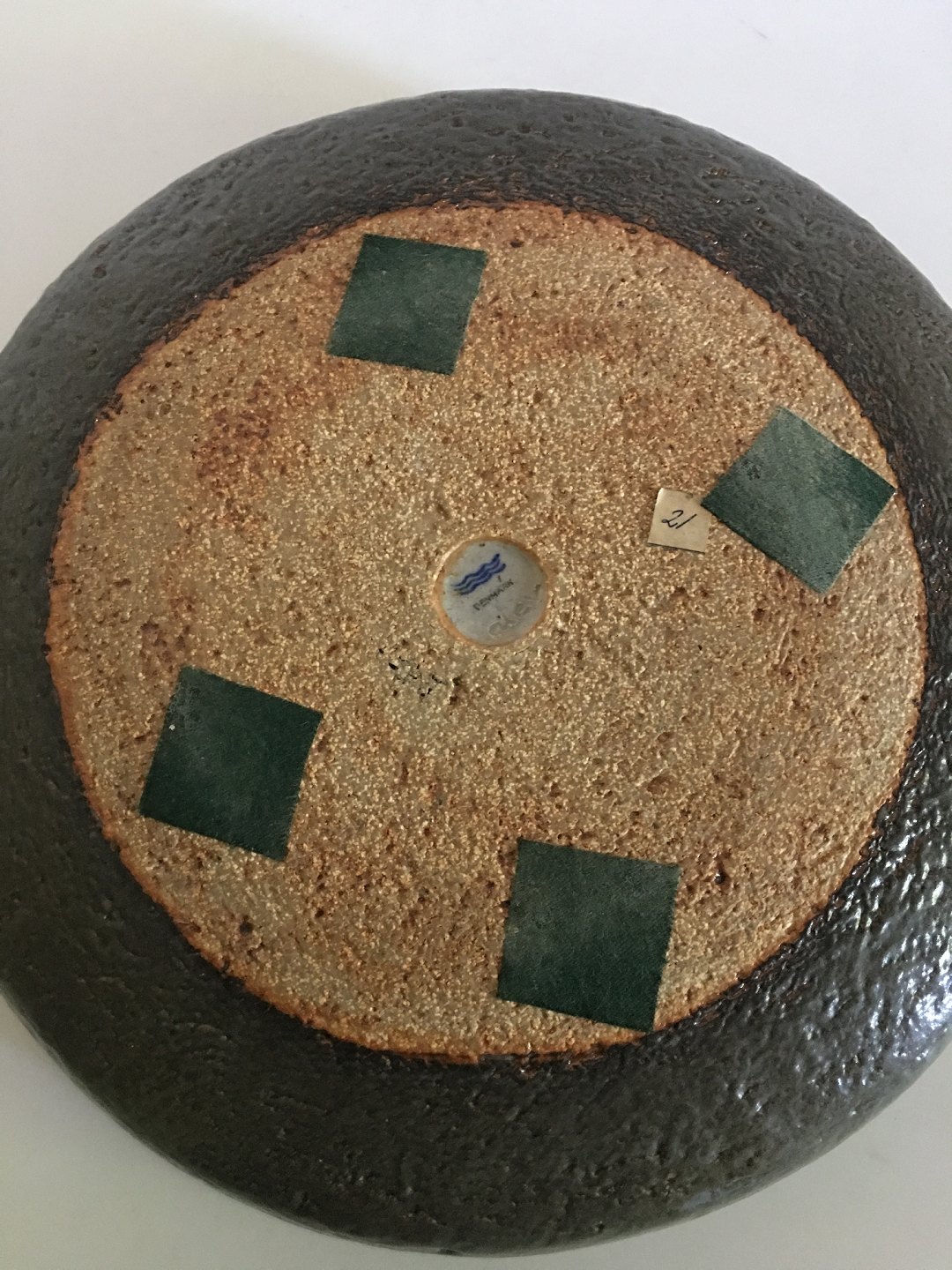 Royal Copenhagen Alev Siesbye Keramik Skål . Olivengrøn 33 cm diameter. 7.5 cm høj. Skålen har desværre fået et slag på kanten (se billede).