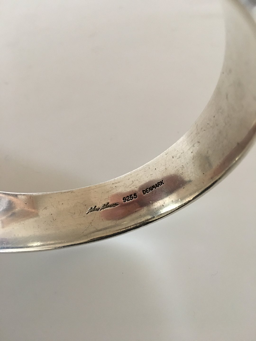 Hans Hansen Sterling Sølv Armbånd. Måler: Indvendig diameter 6,4 cm, Bredde 1,6 cm. Vejer 62 g.