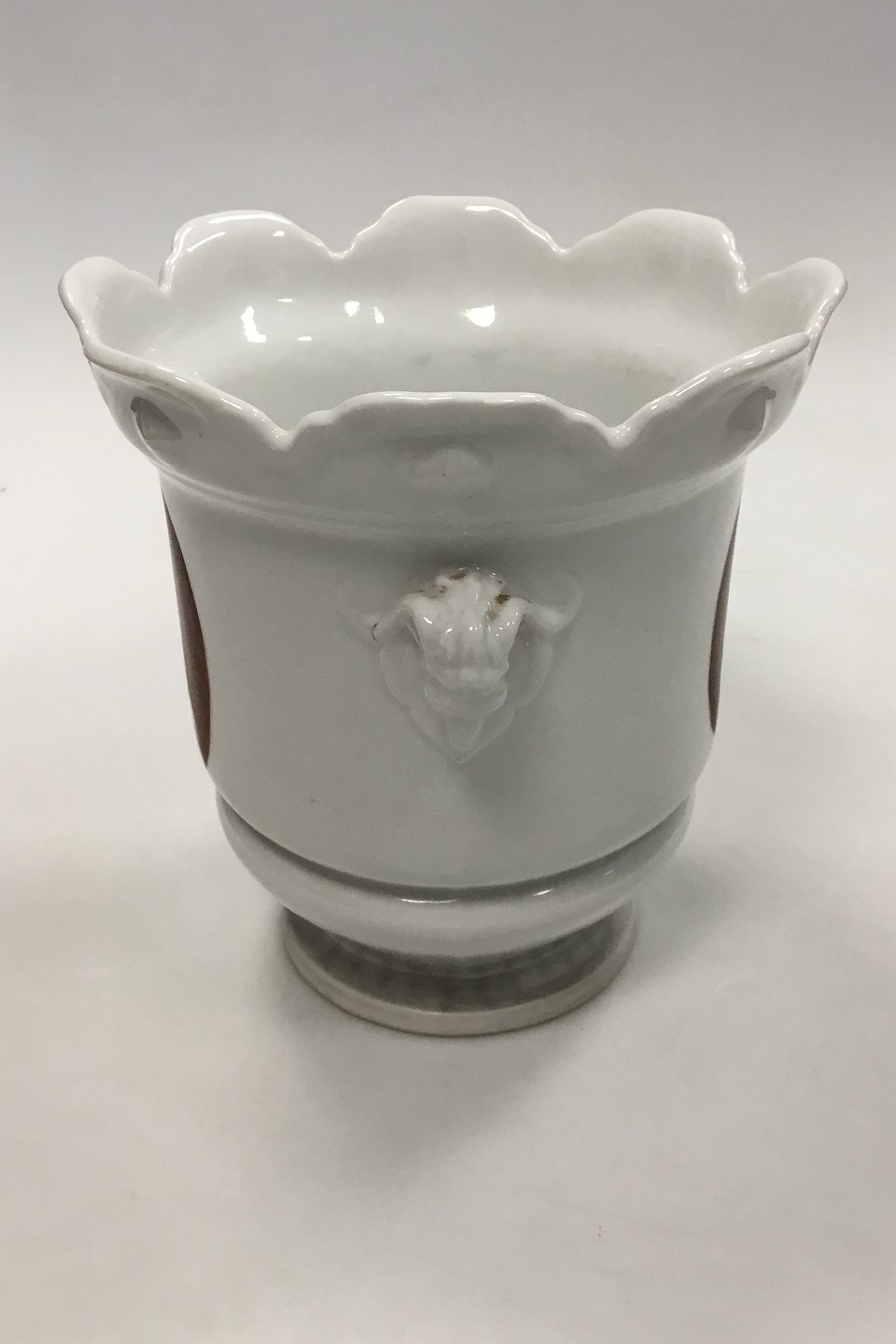 Urtepotteskjuler af hvid porcelæn dekoreret med vædderhoveder og kvindeportrætter. Måler 19 cm(7 31/64 in.)