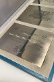 Georg Jensen Sterling Sølv Præsentationsæske med 3 sølvplader Unika Eksempler på gravering hhv bogstav/tekst, motiv og monogram/heraldik Måler hhv 9 cm x 12 cm, 9.5 cm x 13 cm og 9 cm x 12 cm(3 35/64 in x 4 23/32 in, 3 47/64 in x 5 1/8 in og 3 35/64 in x 4 23/32 in)( Antageligvis lavet til et salgsfremstød i USA)