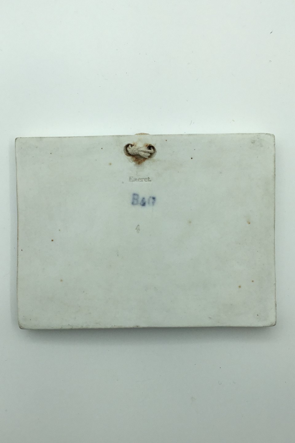 Bertel Thorvaldsen: Royal Copenhagen Porcelæn Biscuit Platte "Amor Virker et Net" No 82. Kopi fra 1852 efter Thorvaldsens original fra Rom 1831. Måler 13,5 x 9,5cm (5.31 x 3.74 inch). To skår. Et midt på toppen og et på kanten til venstre.