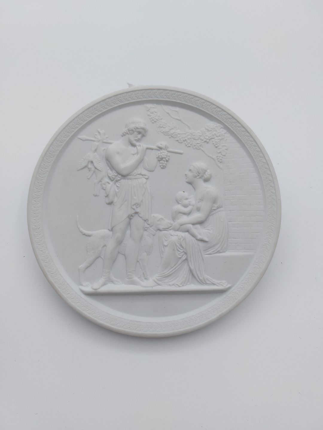 Bertel Thorvaldsen: Royal Copenhagen bisquit platte "Mandom og efterår" Efter relief modelleret i Rom 1836. Måler 13.5cm (5.31 inch). Fremstillet i 20. århundrede