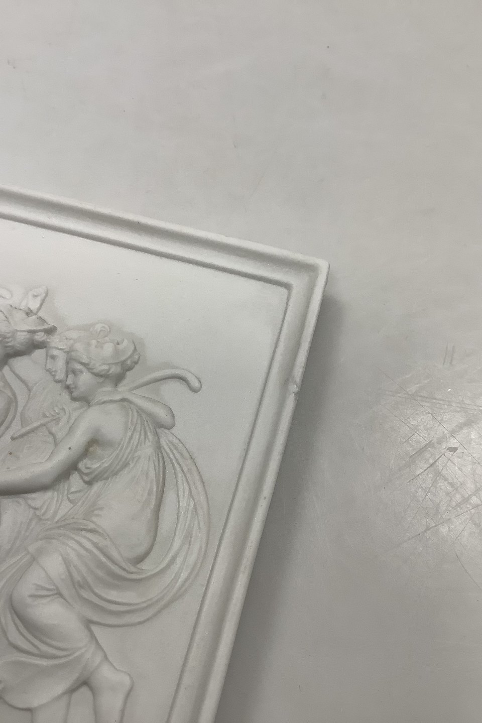 Bing og Grøndahl Bisquit "Musernes dans på Helikon". Kopi af relief modelleret i Rom i 1816. Måler 12,3 cm x 24,8 cm. Et afslag i venstre side og højre side mit på. se billeder.