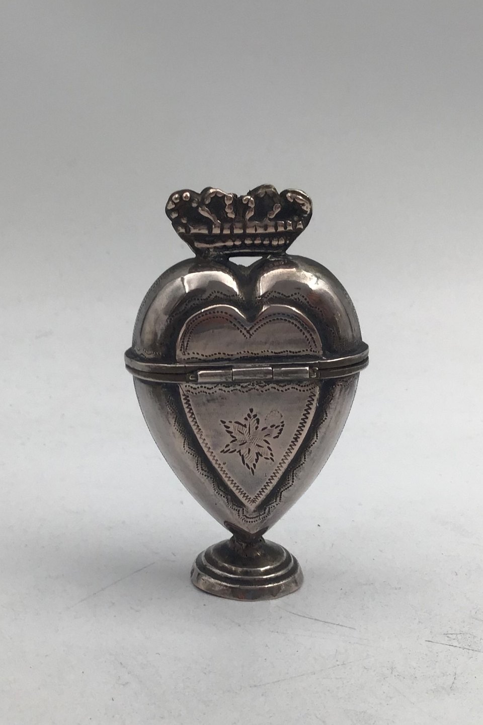 Dansk? Sølv Hovedvandsæg Hjerteformet med Krone Måler H 7.5 cm (2.95 inch) Bredde 4.5 cm (1.77 inch) Vægt 22.9 gr (0.81 oz) (Utydeligt stemplet) Brugsspor
