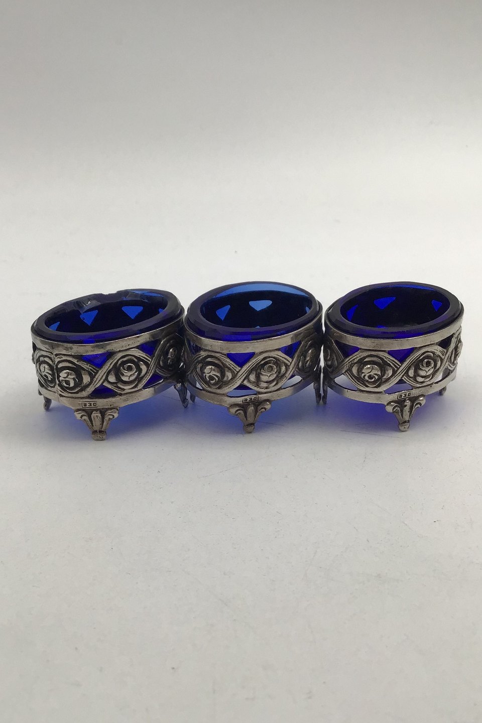 Sølv Saltkar Sæt (Blå glasindsats) (2+1) Måler 3.5 cm x 2.8 cm (1.37 inch x 1.10 inch) Samlet vægt 66.4 gr (2.34 oz) (En er skåret)