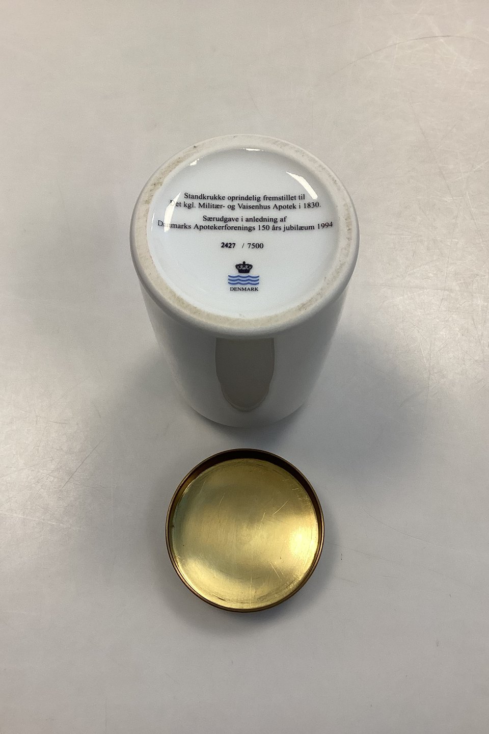 Royal Copenhagen Apotekerkrukke Crocus - Særudgave for Danmarks Apotekerforenings 150 års jubilæum i 1994. Standkrukke med messinglåg oprindelig fremstillet til Det kgl. Militær- og Vaisenhus Apotek i 1830. Eksemplar No. 2427 af 7500. Måler 16 cm / 6,30 in.