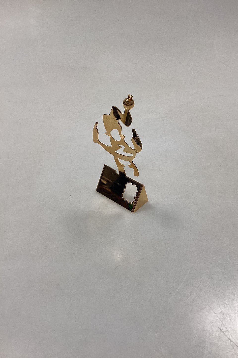 Georg Jensen Christmas Classics Julepynt - Nisse på Julekort. Designet af Leo Griffin. Stål forgyldt med 24-karat guld.