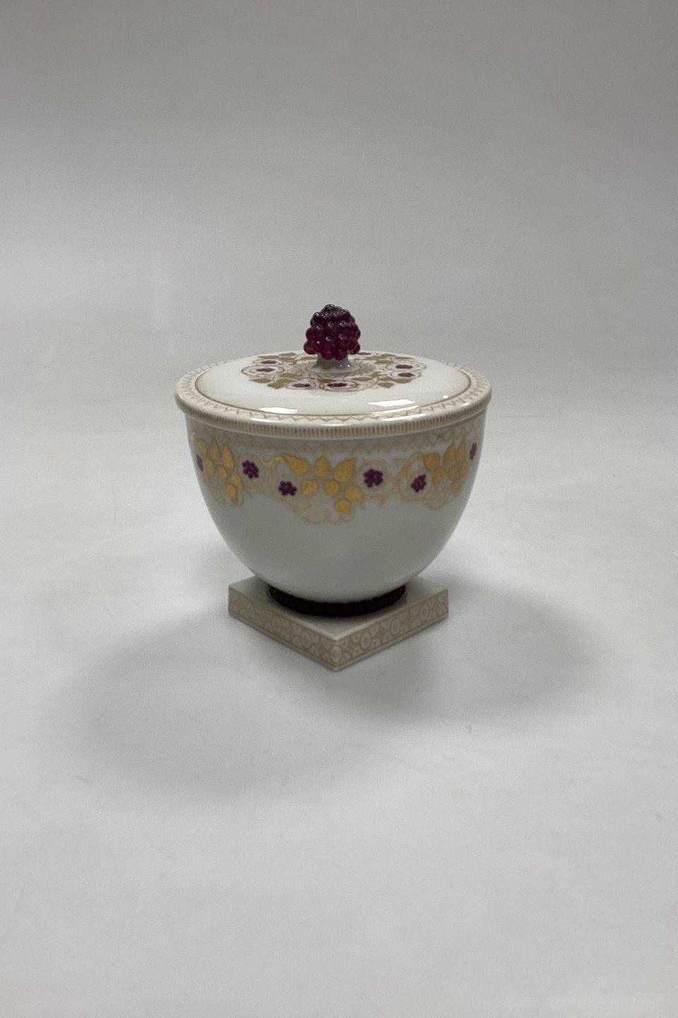 Bing og Grøndahl Hans Tegner Bonboniere med druer. Hvid med drueranker i guld og lilla druer i overglasur. Signeret HT/Hans Tegner, LL/Lotte Lindahl og EK/Emma Kongsbøll.
