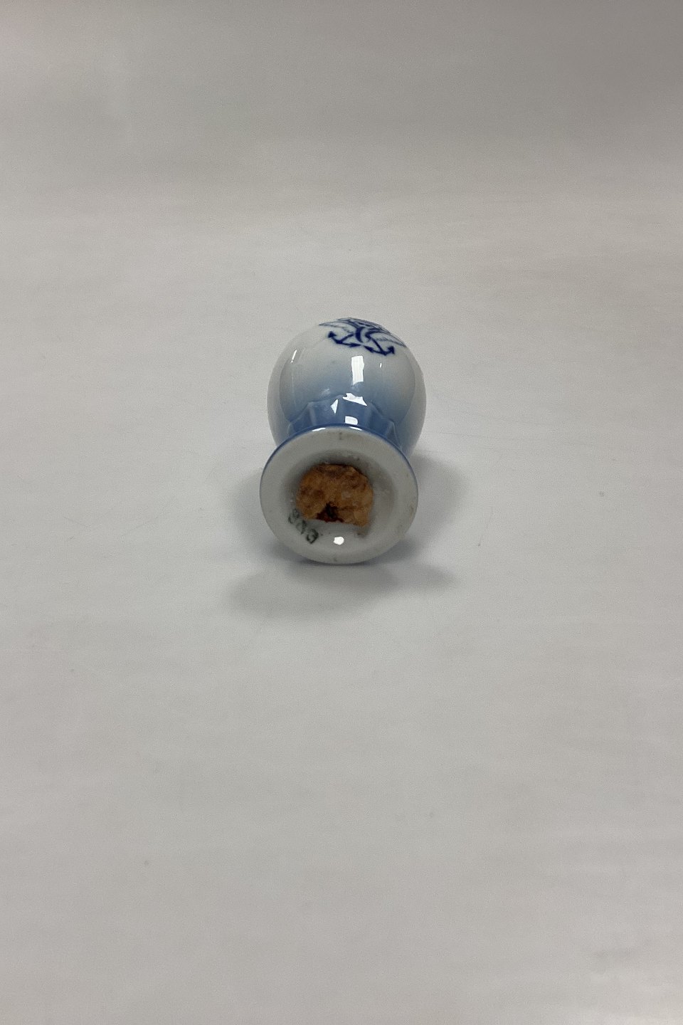 Bing og Grøndahl Blå Tone Saltbøsse No. 52 A med Logo. Logo med krone, hjul med vinger og ankre er højst sandsynligt fra et shippingfirma.