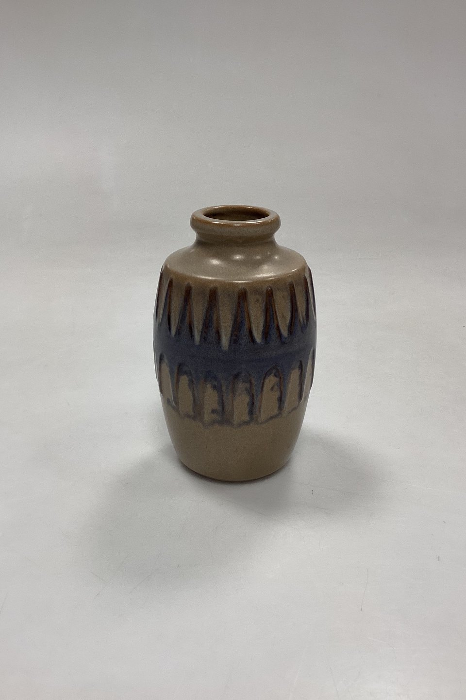 L. Hjort Keramik Vase. Beige, brun og blå glasur med moderne grafisk dekoration.