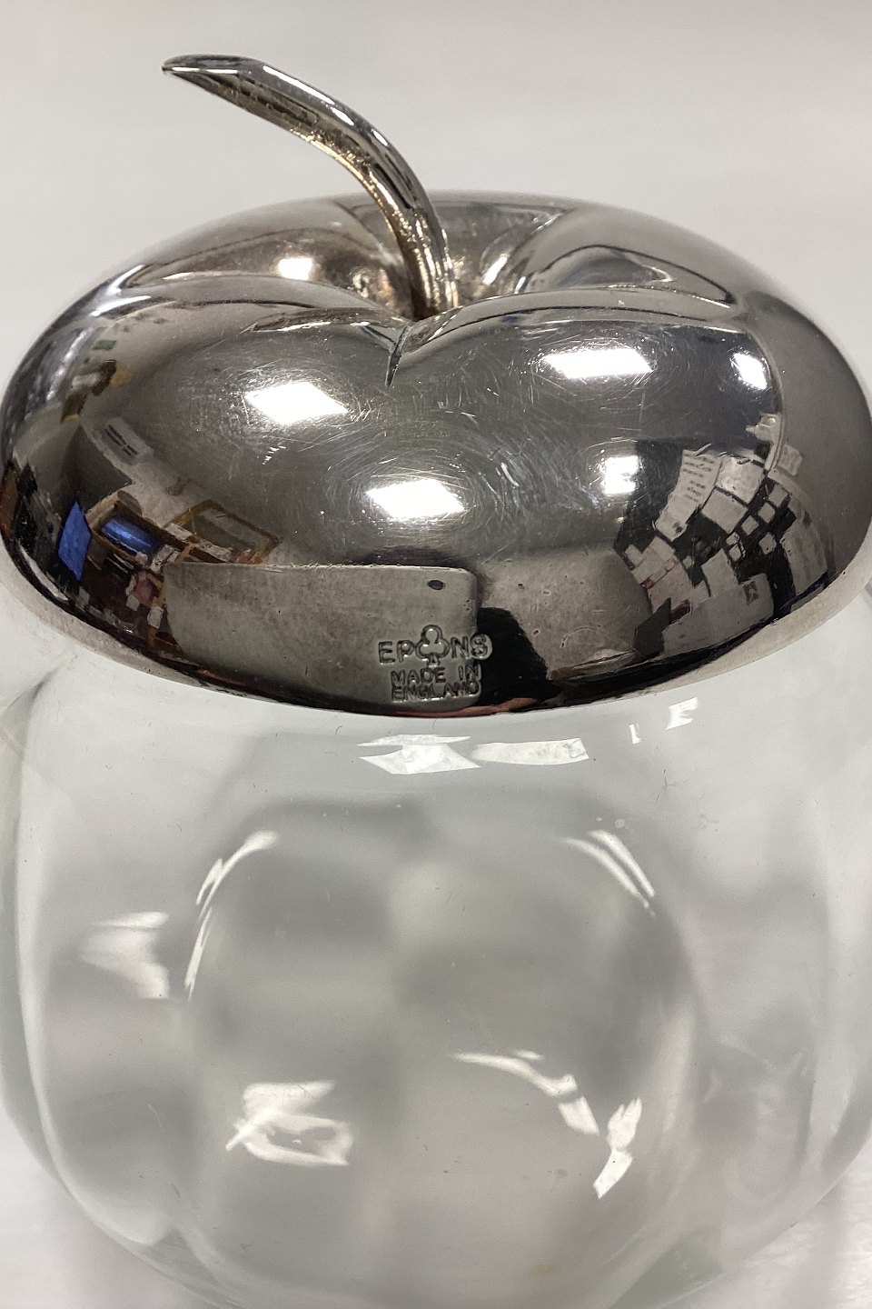 Engelsk Sølvplet/EPNS Marmeladekrukke. Glasset har optiske riller, og låget er formet som toppen af et æble.