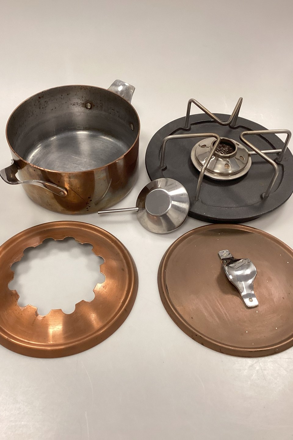 Komplet sæt med gryde, låg, holder, brænder og bundfad. Tydelige brugstegn, men i god stand.