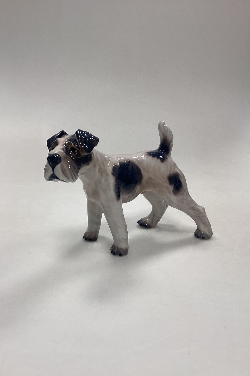 Dahl Jensen Figur - Ruhåret Foxterrier No. 1009. Beigebrun med mørke aftegninger. 2. Sortering med lille sort plet på ryggen.