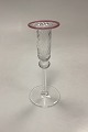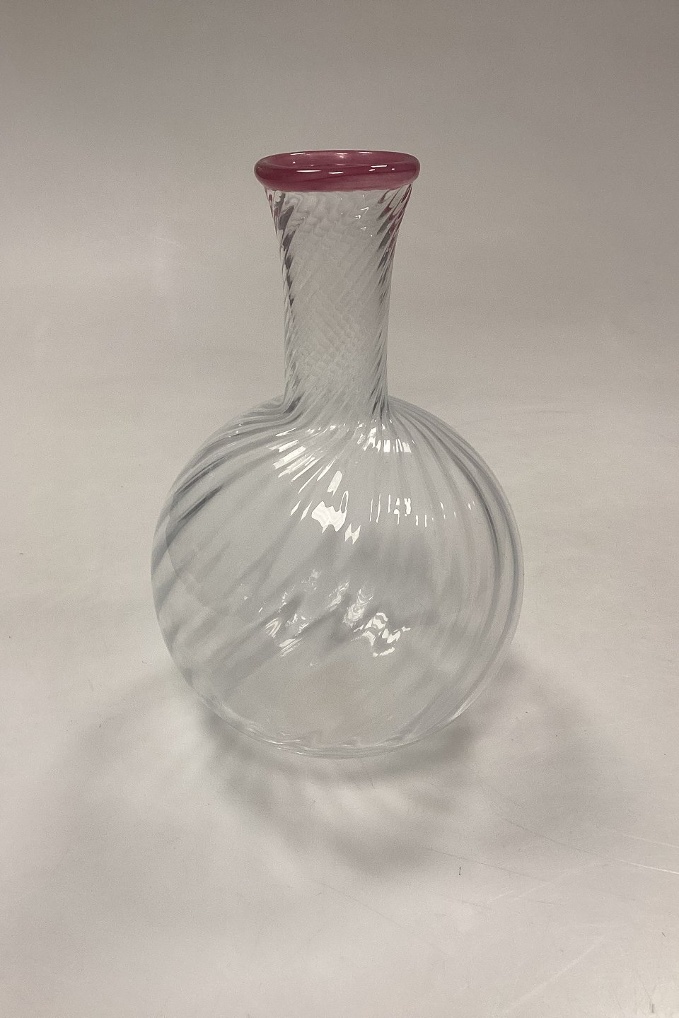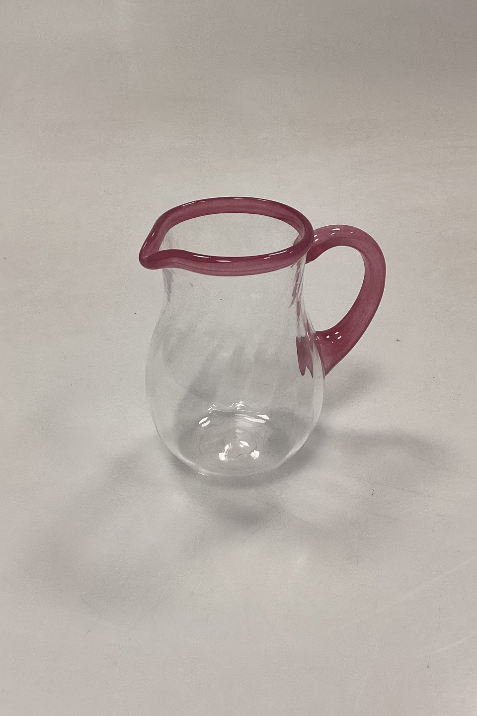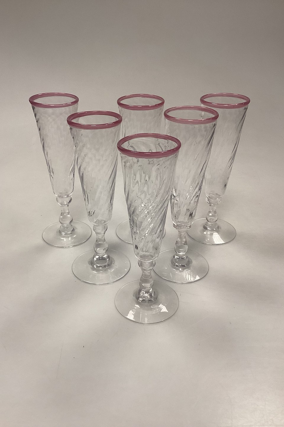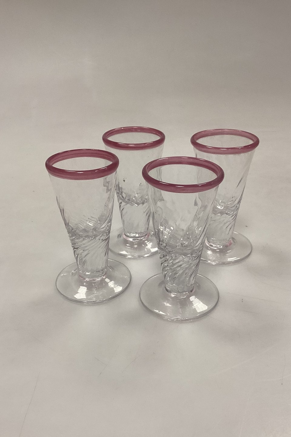 Stort sæt af håndlavede glas på 24 dele. Klart glas med snoet optik og rosa kant.